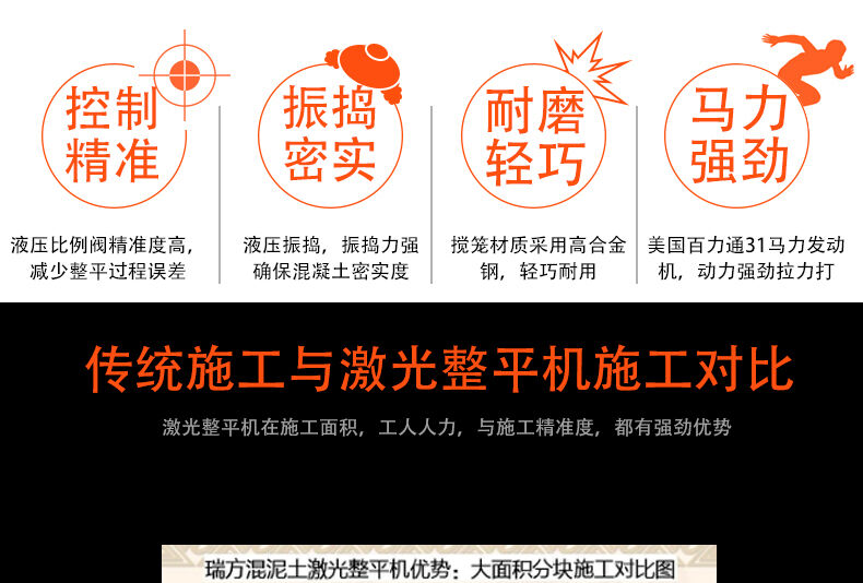 奧力德激光整平機是根據(jù)現(xiàn)代工業(yè)廠房、大型商場、 及其他大面積水泥混凝土地面等對地面質(zhì)量如 、平整度、水平度等越來越高的需求而研制的。使用精密激光整平機鋪注整平的水泥混凝土地面,較按常規(guī)方法所鋪注的地面質(zhì)量要好得多——地面平整度及水平度提高3倍以上,密實度及強度提高20%以上。同時還能夠提高工效超過50% , 并節(jié)省約35%的人工。此外,它能容易地鋪注高強 、低坍落度混凝土和纖維泥凝土。其激光系統(tǒng)配備多種自動控制元件,以每秒10次的 實時監(jiān)測整平頭的標(biāo)高,確保鋪注的地面平整度和水平度得到有效的控制。同時,其強力振動器振動頻率達4000次/分鐘,確?;炷琳駬v密實,使整個鋪注的混凝土基體均質(zhì)、致密