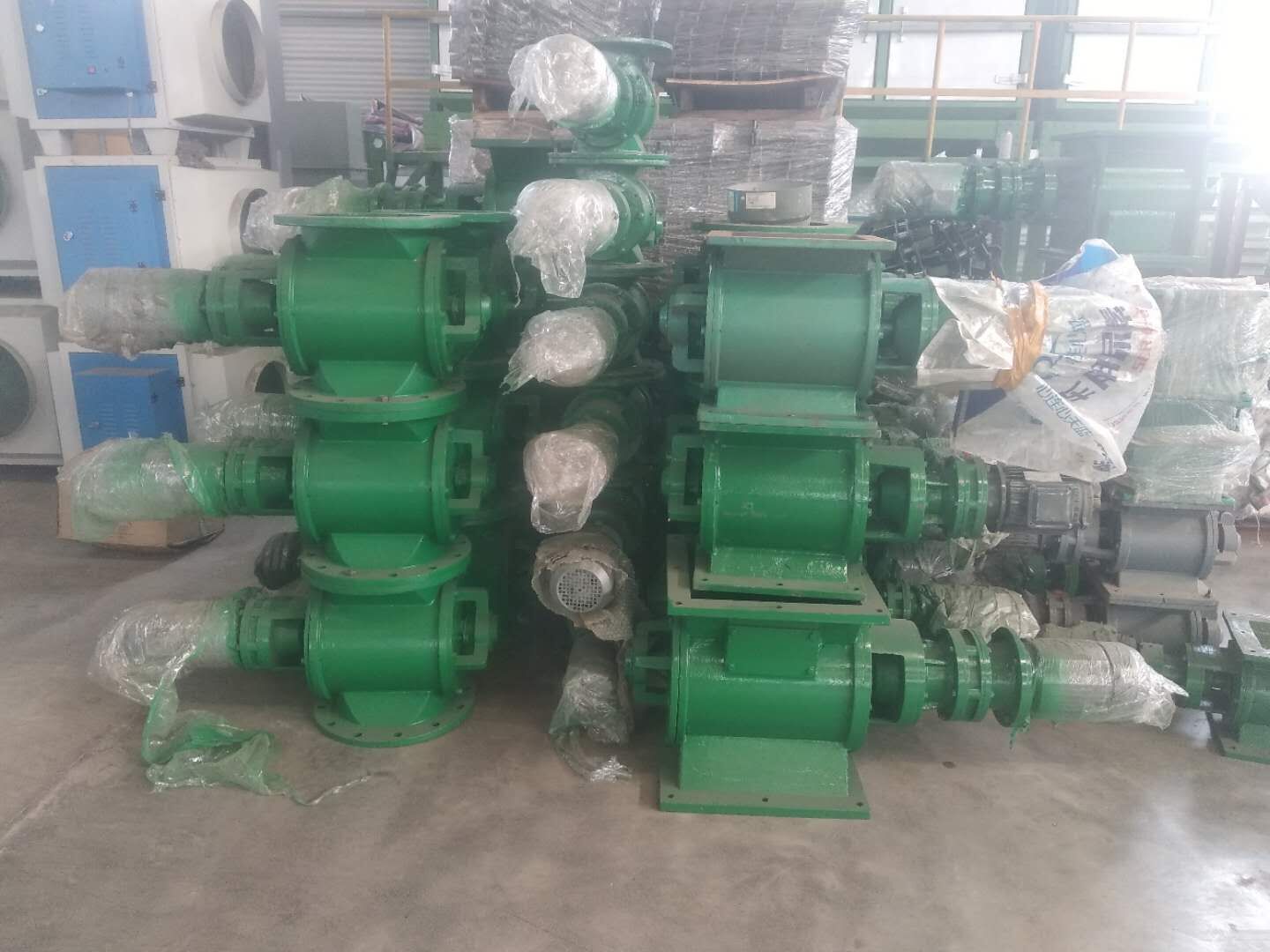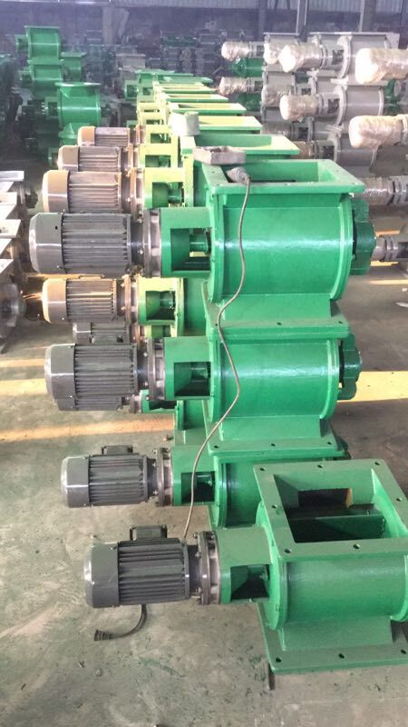 工作原理:星型卸料器工作時(shí),粉塵靠重力落入,充滿上面和側(cè)面的星形葉片空格。葉片轉(zhuǎn)子由電動(dòng)機(jī)通過(guò)減速機(jī)轉(zhuǎn)動(dòng)軸帶動(dòng),葉輪轉(zhuǎn)到下部粉塵靠自重卸下。這種卸塵器一般都安裝在除塵器灰斗下部,為保證連接處的嚴(yán)密不漏風(fēng),在回轉(zhuǎn)卸料器的上部應(yīng)經(jīng)常保持(儲(chǔ)存)一定高度的粉塵。因?yàn)槿~輪轉(zhuǎn)動(dòng)時(shí),卸完粉塵后葉輪轉(zhuǎn)上的那一面經(jīng)常是沒(méi)有粉塵的,所以容易使空氣漏入。為了保持一定高度的灰柱,而且不致卸空,*在灰斗內(nèi)裝設(shè)料位信號(hào)設(shè)施,并與卸塵閥的電動(dòng)機(jī)建立連鎖。