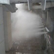 干霧抑塵實(shí)踐證明,粉塵可以通過水或化學(xué)劑被粘結(jié)而聚結(jié)增大。但那些最細(xì)小的粉塵只有當(dāng)水滴很小(如水霧)或加入化學(xué)劑(如表面活性劑)以減小水的表面張力時(shí)才會(huì)聚結(jié)成團(tuán)。如果水霧顆粒直徑大于粉塵顆粒,那么粉塵僅僅跟隨水霧顆粒周圍的氣流運(yùn)動(dòng),