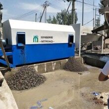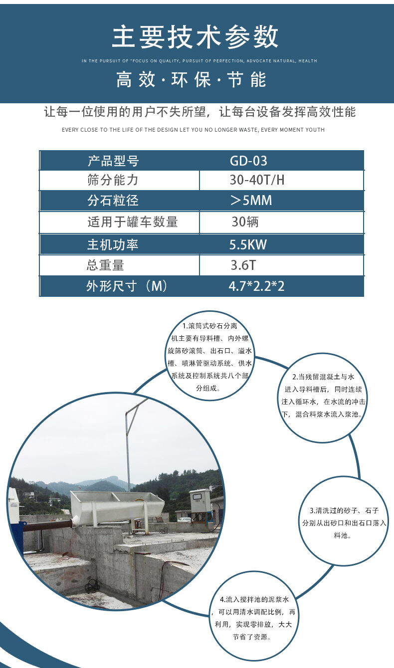 滾筒式砂石分離機(jī)主要有導(dǎo)料流槽、內(nèi)外螺旋篩砂滾筒、出石口、溢水槽、噴淋管、驅(qū)動(dòng)系統(tǒng)、供水系統(tǒng)及控制系統(tǒng)共八個(gè)部分組成。當(dāng)殘留混凝土與水進(jìn)入導(dǎo)料槽后,同時(shí)連續(xù)注入循環(huán)水,在水流的沖擊下,混合料漿水流入漿池。清洗過(guò)的砂子、石子分別從出砂口和出石口落入料池。流入攪拌池