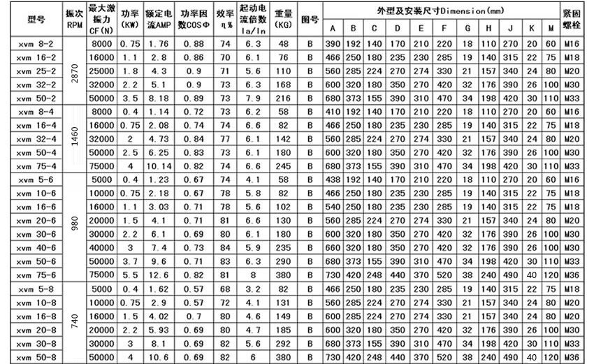 1)XVM振動電機 此型號振動電機系采用先進技術(shù)設(shè)計生產(chǎn)的振動電機。 XVM振動電機2)先進的設(shè)計技術(shù):所有參數(shù)的計算及其優(yōu)化設(shè)計均由計算機工作站全面完成。精密的加工工藝、嚴格的質(zhì)量體系,保證了振動電機工作狀態(tài)下各部件配合、承力在最佳范圍內(nèi)。 3)特殊的電磁設(shè)計:振動電機所需要配置的定、轉(zhuǎn)子均采用具有優(yōu)質(zhì)導(dǎo)磁性能的硅鋼片,減少鐵芯的渦流損耗,保證強大的起動力矩,可快速達到額定運轉(zhuǎn)速度。 4)重載型軸承設(shè)計:所采用軸承均為重載型特制軸承,足以承受和傳遞徑向激振力和軸向負荷,并有良好的散熱能力。雙重密封設(shè)計,保證在嚴重粉塵環(huán)境下的軸承室清潔。選用進口耐高溫軸承鋰基脂潤滑油,延長軸承使用壽命。 5)無極調(diào)節(jié):振動電機兩端的激振塊上標有精確的刻度盤,可以非常容易的調(diào)節(jié)激振力及工作力矩從零到最大的無極調(diào)節(jié),滿足工作需要。 6)。XVM振動電機的設(shè)計可適用于各種標準電壓及頻率的三相交流電源,如適用于中國、歐洲的220/380V、50HZ電壓等級;美國的230/460V、60HZ電壓等級;日本的220V、50/60HZ電壓等級等,能應(yīng)用于世界各地。還可適用各種電氣制動方式,如能耗制動、反接制動等。