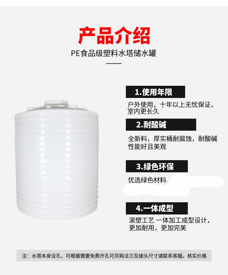 貴州1噸水箱、貴陽儲水箱、貴陽水塔用途:高層建筑二次供水、蓄水水處理凈化設(shè)備配套工業(yè)用冷卻水化工制劑、化工原料、各種油品、飲品的儲存、運(yùn)輸。質(zhì)量保證:7天包換(非人為及不可抗拒的因素),1年免費(fèi)維修。塑料平底儲罐:主材:進(jìn)口韓國聚乙塑膠原料。 常用顏色:橙、藍(lán)、綠、黑等。性能:一次成型內(nèi)外光滑,具有良好的衛(wèi)生性與抗紫外線能力。撞擊,搞強(qiáng)震,不易老化,不長水藻,易清洗,安裝移動方便。應(yīng)用范圍:高層建筑二次供水,城鎮(zhèn),農(nóng)村屋頂蓄水,廣泛應(yīng)用于食品、制藥、賓館、酒店、電子、化工噴織等行業(yè)。 安裝說明及注意事項:1、每只水箱開進(jìn)水、出水、排污三孔,有特殊要求另定。2、屋頂水箱應(yīng)放置在受力狀況良好的樓梯開間或平臺上。3、水箱為普力容器,故控制液位應(yīng)加裝浮球或其它有效控制裝置。