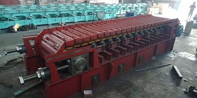 牽引鏈采用配套廠家的履帶鏈,節(jié)距誤差小,強(qiáng)度高,不宜變形,并且在使用期內(nèi)無須潤滑,日常操作維修方便快捷。鏈板底全部采用錳鋼板制作,采用單圓弧搭接結(jié)構(gòu)形式,工作時始終處于相互搭接狀態(tài)??箾_擊,耐磨損,鏈板之間不漏料,安全可靠。每個鏈板兩側(cè)采用導(dǎo)向板定位,通過8個螺栓與履帶鏈牢固連接,保證了鏈板相互之間咬合準(zhǔn)確。鏈板底板下面焊有加強(qiáng)筋板,鏈板運(yùn)行時有四列滾輪支撐,可保證承受大的物料沖擊而不變形。整機(jī)現(xiàn)場的粉塵、噪音狀況大為改善,工人操作環(huán)境得到了明顯改進(jìn)。