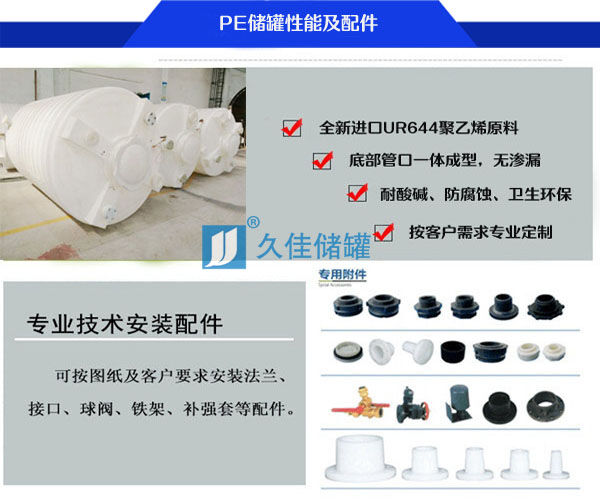 特點:所用材質(zhì)為韓國進(jìn)口聚乙烯(PE)滾塑原料,儲罐一次成型,內(nèi)外光滑,無焊接縫、不滲漏、具有良好的衛(wèi)生性與抗紫外線能力,耐酸堿、耐腐蝕、易清洗、不易老化、抗沖擊。它可以盛裝在常溫下無機酸、堿、鹽等大部分物質(zhì)及有機物,耐熱耐凍性佳,在-5℃—+60℃均可使用。