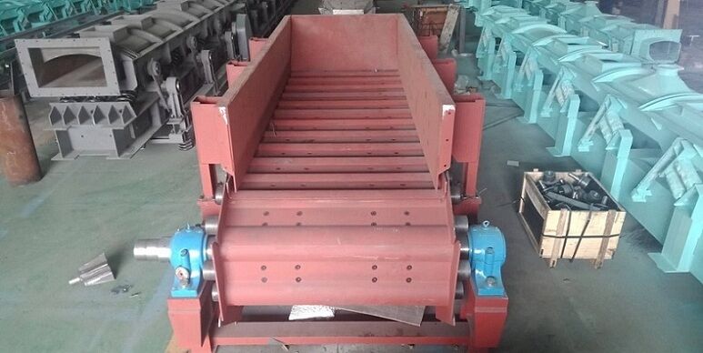 通過分析研究上述問題,結(jié)合國(guó)內(nèi)外給料機(jī)使用情況,重新設(shè)計(jì)制作了一臺(tái)新型給料機(jī),主要特點(diǎn)是:采用板式給料機(jī)連續(xù)給料;板式給料機(jī)料板采用雙圓弧、節(jié)點(diǎn)重合的方式,解決了漏料問題;板式給料機(jī)安裝角度為18°,可使物料緩慢分散跌落到皮帶機(jī)上;撥料棍采用逆物料方向旋轉(zhuǎn),以控制物料層的厚度;料斗設(shè)計(jì)采用漸開式,解決了膨料問題;電機(jī)采用變頻控制,可控制出料速度。經(jīng)過三個(gè)多月的的現(xiàn)場(chǎng)使用,證明能夠完成勻料,效果較好。