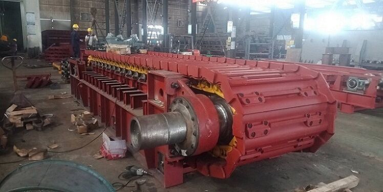 座部件由機(jī)架和支承件組成。機(jī)架由鋼材焊接而成,支承部件有支重輪、下托輪和縱向?qū)к?,輸送板得到支重輪和縱向?qū)к壍碾p重支持,使支重更均勻合理。牽引鏈基本上不受礦石和自重產(chǎn)生的張力作用,支重輪外側(cè)設(shè)計有凸臺,與主、從動輪聯(lián)合作用,成功地杜絕鏈軌跑偏。在機(jī)架下方設(shè)有下托輪,為方便維修,下托輪為側(cè)裝式。
