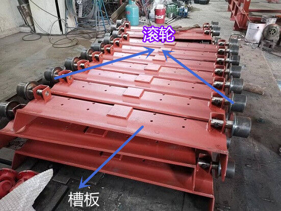 承載構(gòu)件——滾輪采用了滾動軸承結(jié)構(gòu),有利于減小運行阻力,減少動力消耗。該結(jié)構(gòu)型式便于維護(hù)。滾輪由支承座和槽板固定,滾輪在軌道上滾動,帶動槽板和槽板上的物料運動。