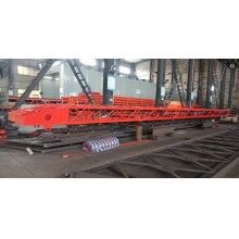 2 用吊車將布料皮帶輸送機吊起,如有必要再用手拉葫蘆調平,用二根連接銷軸與三角支架連接,將布料皮帶輸送機放在安全凳上(安全凳應置于布料皮帶輸送機最前端)。