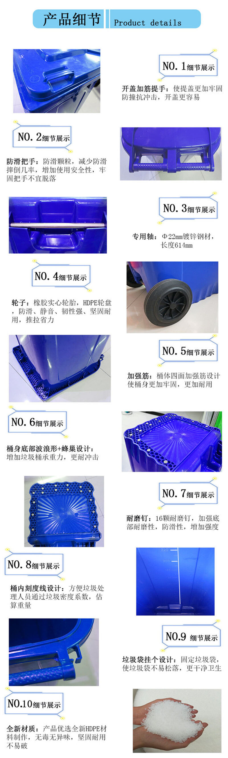 240L塑料垃圾桶/塑料環(huán)衛(wèi)垃圾桶,桶蓋密合,可防止異味散發(fā),雨水侵入,蚊蠅滋生,桶身可相互套疊,方便運輸,節(jié)省儲運空間與費用,桶內(nèi)外表面光潔,便于倒空垃圾與清洗,垃圾桶設(shè)計符合 人體工程學(xué),輕便耐用,移動靈活。產(chǎn)品賣點。240L塑料垃圾桶價格不浪費,讓城市更美觀少占地:生活垃圾中有些物質(zhì)不易降解,使土地受到嚴(yán)重侵蝕。垃圾分類,去掉能回收的,不易降解的物質(zhì),減少垃圾數(shù)量達(dá)50%以上。少環(huán)境污染:廢棄的電池含有金屬。約資源鎘等有害的物質(zhì)。