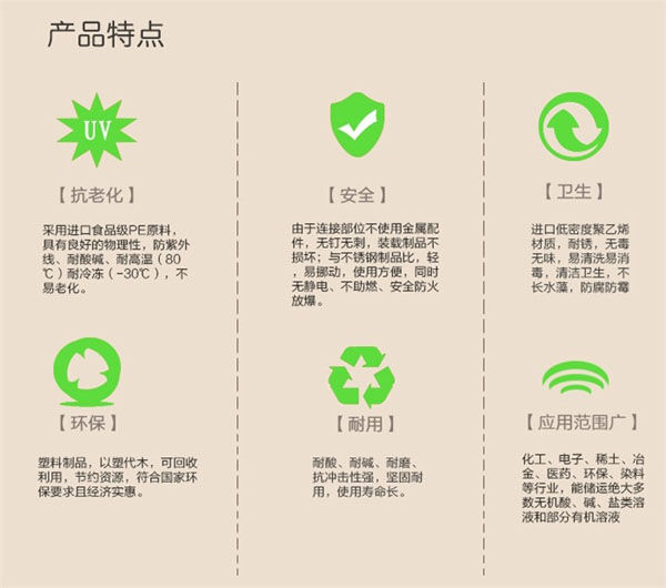 2、經(jīng)濟(jì)耐用:抗老化、耐腐蝕、防紫外線、耐酸堿、耐高溫(65℃以下)、耐冷凍(-5℃)使用壽命長(zhǎng)