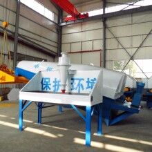 落地式砂石分離機整套系統(tǒng)主要由:攪拌車加水清洗裝置,溜槽裝置,砂石漿水分離裝置,和泥漿水后處理裝置組成。混凝土輸送設(shè)備清洗后,將殘余混凝土排入溜槽中,在高壓水流沖擊下,經(jīng)溜槽進入砂石分離機,在不斷旋轉(zhuǎn)的分離機作用下,對混凝土進行充分的清洗,同時將砂石、漿水進行分離,分離后的砂、石在導(dǎo)料葉片的作用下背向流動至出料口排出分離機落入振動篩分機,通過篩分將沙、石子分開,分別堆放。清洗后的漿水從分離機的溢水口排出進入濃漿池,經(jīng)污水泵加壓打到旋流器除去多余固體微粒,降低漿水濃度,進入攪拌池回收利用。進入攪拌池的漿水為了防止沉淀凝固,需通過攪拌器的作用,攪拌器的工作為間歇式。分離出水泥漿在連續(xù)的攪拌器作用下,再通過高壓污水泵輸送到攪拌樓中待生產(chǎn)再利用。整個控制系統(tǒng)設(shè)有手動和自動控制,方便控制設(shè)置,整個系統(tǒng)運行可靠,故障率低,維護量少等特點。