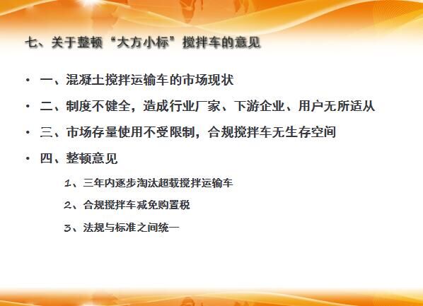隨后,會(huì)長(zhǎng)分析了攪拌車的市場(chǎng)現(xiàn)狀,制度不健全,造成行業(yè)廠家、下游企業(yè)、用戶無(wú)所適從,市場(chǎng)存量使用不受限制,合規(guī)攪拌車無(wú)生存空間;同時(shí)提出了建設(shè)性的整頓意見(jiàn)。