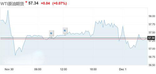 紐約商業(yè)交易所1月交割西德克薩斯中質(zhì)油(WTI)上漲10美分,收于每桶57.40美元。
