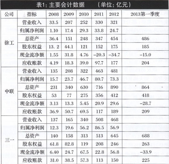 分析表3中數(shù)據(jù),參考近年三駕馬車資金投向,隱含在數(shù)據(jù)后面的一個事實就浮出水面:經(jīng)過幾年布局,各有斬獲后,出于做大做強企業(yè),保優(yōu)勢、補短板需要,挖掘機市場將是徐工、中聯(lián)的發(fā)力點;徐工還將全面進入混凝土機械市場,2012年報顯示,其占比首次達到12%;三一則必然會在起重機市場加在投入,另外其路面機械也對徐工形成沖擊態(tài)勢。作為行業(yè)領(lǐng)跑者,三駕馬車都在投巨資、博市場,期待追平或拉開與對手的距離。這就是三駕馬車現(xiàn)金流量表中,投資活動現(xiàn)金流量長期負數(shù)的主要原因。