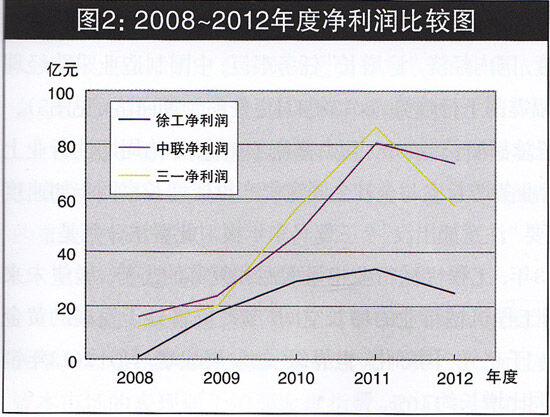 公司的成長與盈利能力正相關(guān)。在年報中,主營業(yè)務(wù)收入增長率、凈利潤增長率、凈資產(chǎn)增長率以及凈資產(chǎn)收益率、毛利率、凈利率等財務(wù)指標,是判斷企業(yè)成長性和盈利能力的重要指標。表2顯示,三駕馬車中,5年主營業(yè)務(wù)收入同比增長率實現(xiàn)連續(xù)5年正增長、連續(xù)三年保持30%以上增長率的公司是中聯(lián),五年中增長率振幅最大的公司是徐工,2012年徐工和三—主營業(yè)務(wù)收入增長率均出現(xiàn)負增長;表2還顯示,凈利潤同比增長率方面,沒有—家公司連續(xù)五年正增長,2012年三駕馬車同時出現(xiàn)負增長,三一錄得-34.26%的最大降幅。在大環(huán)境不利因素作用下,公司成長性受到嚴峻挑戰(zhàn)(見圖2)。