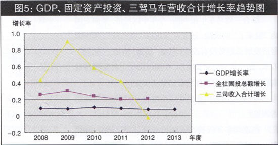 周期性行業(yè)受周期制約的特點,決定周期性行業(yè)要避免誤判宏觀經(jīng)濟發(fā)展趨勢,才能健康發(fā)展。5年來,三駕馬車—直在擴張產(chǎn)能,在經(jīng)濟下行壓力加大、GDP增長率持續(xù)回落的宏觀背景下,主要財務(wù)指標必然加速度回落(見圖4)。面對如此局面,要保持增長勢頭,就必須準確判斷宏觀經(jīng)濟趨勢,調(diào)整企業(yè)發(fā)展戰(zhàn)略。三駕馬車,是如何判斷宏觀經(jīng)濟發(fā)展趨勢的呢?