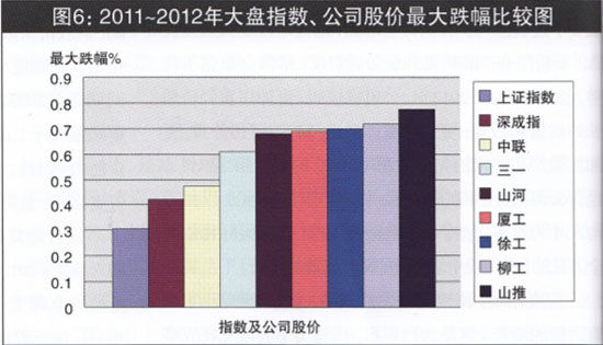 2011年,行業(yè)遭遇寒冬,三駕馬車營業(yè)收入合計增三率與宏觀經(jīng)濟指標對比,呈加速度下跌態(tài)勢,而且在資本市場的表現(xiàn)弱于滬深大盤指數(shù)。2011年~2012年間,其股價從最高點至最低點,下跌47.3%、61.2%、69.8%不等;而同期上證指數(shù)下跌幅度只有30.67%,深成指下跌42.1%。盡管與行業(yè)內(nèi)其他上市公司同期資本市場表現(xiàn)相比,工程機械行業(yè)三駕馬車的表現(xiàn)仍有亮點,但其同期跌幅大于上證和深成指跌幅,仍然令公司形象受損,影響資本市場再融資能力。因此,打造公司核心競爭力,提升公司投資價值,提振資本市場投資者信心,至關(guān)重要(大盤指數(shù)、公司股價最大跌幅比較圖,見圖6)。