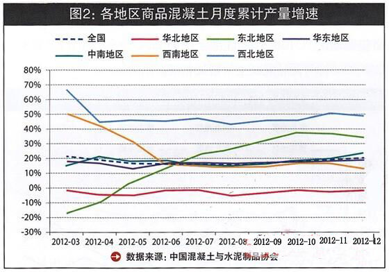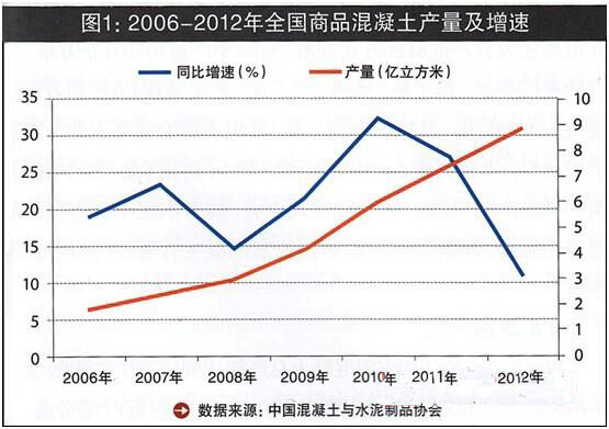 2012年前三季度,房地產(chǎn)調(diào)控和重點(diǎn)在建續(xù)建大型工程項(xiàng)目啟動(dòng)緩慢,商品混凝土市場需求大幅下降,前三季度累計(jì)同比增長7.9%,到了第四季度增幅有所回升,最終全年增速在11%。