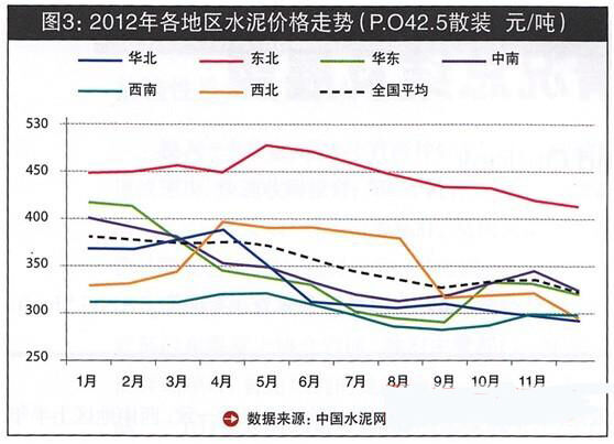 商品混凝土價(jià)格主要取決于成本方的水泥價(jià)格及需求情況,2012年全國水泥價(jià)格呈現(xiàn)前高后低的"U"型走勢,東北地區(qū)價(jià)格保持在全國最高位運(yùn)行,西南成為全國水泥價(jià)格凹地。