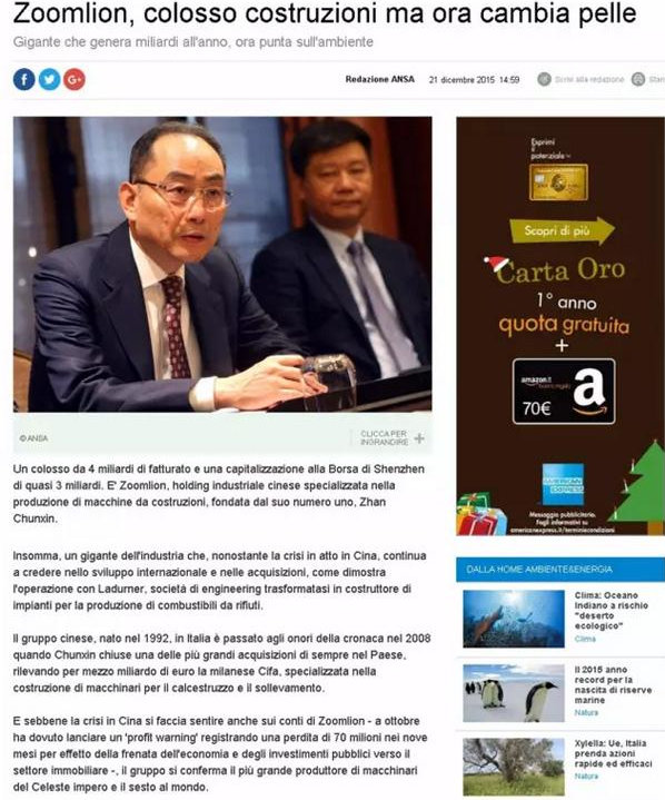 意大利知名國(guó)際通訊社安莎通訊社(Agenzia nazionalestampa associata,ANSA)今日在其網(wǎng)站首頁(yè)連續(xù)重磅發(fā)布三篇報(bào)道,聚焦中國(guó)企業(yè)中聯(lián)重科收購(gòu)意大利領(lǐng)先環(huán)保企業(yè)LADURNER(納都勒)公司,中聯(lián)重科董事長(zhǎng)詹純新,公司副總裁、環(huán)境集團(tuán)總裁張建國(guó)接受了安莎社記者的專訪。