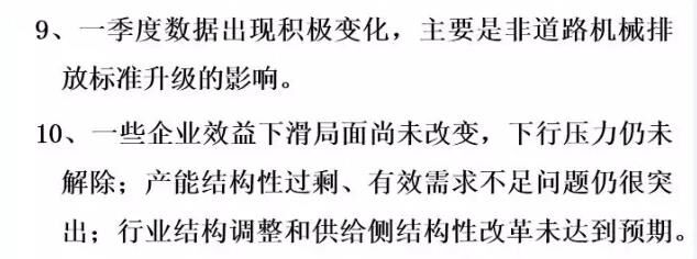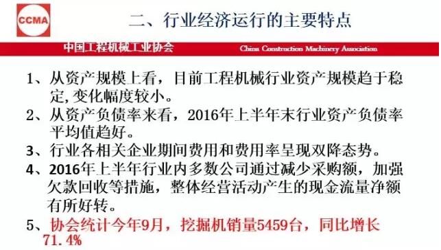 我個(gè)人總結(jié),今年的運(yùn)行情況有這樣十個(gè)方面。第一,從整個(gè)全行業(yè)各企業(yè)的資產(chǎn)規(guī)模上看,目前趨于穩(wěn)定,變化幅度很小,不像前兩年振動那么大。第二,從資產(chǎn)負(fù)債率來說,現(xiàn)在負(fù)債率是在60%左右,全國的工業(yè)企業(yè)是56%。所以,這個(gè)行業(yè)的資產(chǎn)負(fù)債率目前看也是很好的。這個(gè)需要引起大家的關(guān)注和分析,我們也希望后幾個(gè)月情況可以穩(wěn)定向好。還有自主品牌市場占有率,在國內(nèi)市場還是保持高位,從全行業(yè)來看在90%以上。那么,產(chǎn)業(yè)的集中度又進(jìn)一步地增強(qiáng)了,但有一些企業(yè)挺無助的,出局了,進(jìn)口額下降。今年按照環(huán)保部5號令,全行業(yè)工程機(jī)械產(chǎn)品實(shí)現(xiàn)了新的標(biāo)準(zhǔn)升級。整個(gè)產(chǎn)品進(jìn)行了更新?lián)Q代,這個(gè)非常難能可貴。最后是產(chǎn)能結(jié)構(gòu)性過剩,有效需求不足問題仍然突出,行業(yè)結(jié)構(gòu)調(diào)整還有供給側(cè)結(jié)構(gòu)改革遠(yuǎn)遠(yuǎn)沒有達(dá)到預(yù)期。即便是按照現(xiàn)在的挖掘機(jī)銷量5500多臺,就算是6000臺,產(chǎn)能又有多少?一旦市場回暖,一些企業(yè)家還是會頭腦一熱,這樣大一個(gè)產(chǎn)能釋放出來的產(chǎn)量是什么局面?我們必須保持一個(gè)清醒的頭腦。